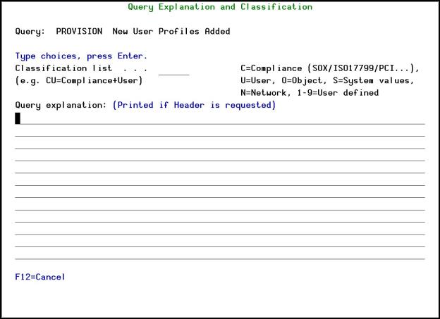 Select the Query to run and press 9=Explanation & Classification. The Query Explanation and Classification screen appears.